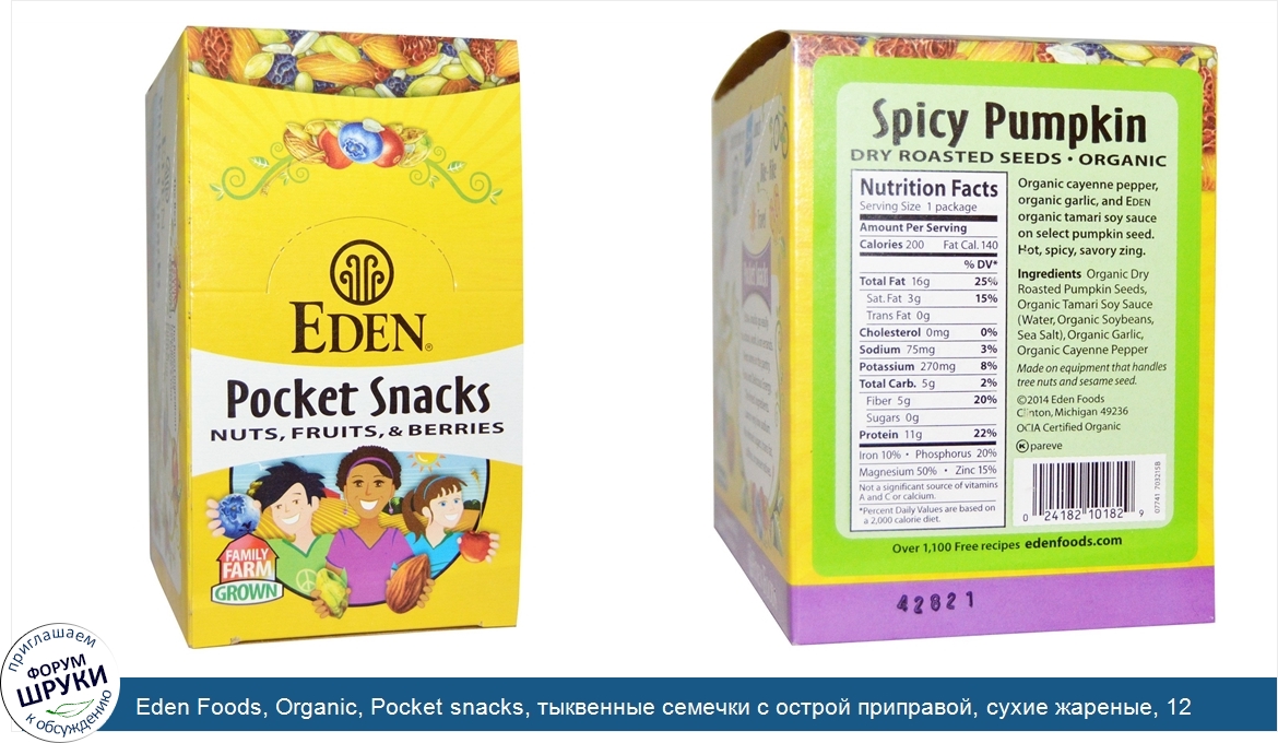 Друзья, если у вас есть отзыв/дополнение/комментарий/вопрос относительно Eden Foods, Organic, Pocket snacks, тыквенные семечки с острой приправой, сухие жареные, 12 пакетиков, 1 унция (28,3 г) каждый - напишите его ответом в эту тему (это будет полезно всему сообществу в целом и вам в отдельности).