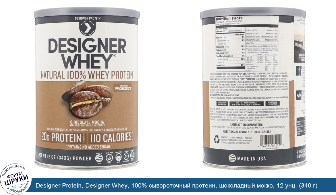 [DESCRIPT]Now with Probiotics. Natural Flavored Sweetened. Protein with 100% of Key-B Vitamins for Energy To Boost Metabolism. 20 g Protein Per Serving. 110 Calories Per Serving. Contains No Added Sugars. GMO-Free - Whey. rBGH-Free - Whey. Certified Gluten-Free. Certified Kosher. rBGH- Free Whey From Milk with No Artificial Growth Hormones. No Artificial Antibiotics. Leading Protein-Rich Nutrition Since 1993. Natural Protein With Added Nutritional Benefits. Designer Protein is a leader in high quality nutrition products. Our range includes proteins and superfoods designed for fitness, performance, weight management overall wellness. Protein-Rich Nutrition. 100% Whey Protein with a full spectrum of peptides, plus vegetable-based digestive enzymes to support protein absorption. B-Vitamins to help convert protein to usable energy, calcium, vitamin D, phosphorus, magnesium, zinc, probiotics and electrolytes for post-workout recovery. Contains natural, prebiotic vegetable fiber - helps you feel full longer keep hunger away for hours. From A Natural Source. Natural, GMO-Free Whey from Midwest cows cared for with a diet free of artificial growth hormones and antibiotics. No artificial colors, flavors, sweeteners or preservatives. No gluten, no added sugar and 97% lactose-free.[/DESCRIPT]... (описание дополняется)