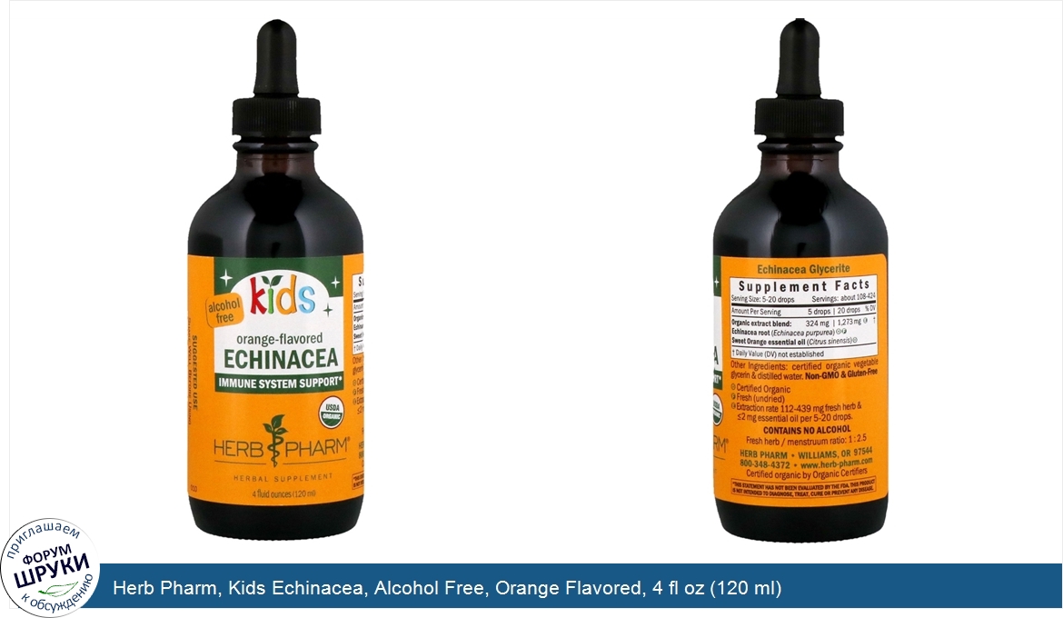 Друзья, если у вас есть отзыв/дополнение/комментарий/вопрос относительно Herb Pharm, Kids Echinacea, Alcohol Free, Orange Flavored, 4 fl oz (120 ml) - напишите его ответом в эту тему (это будет полезно всему сообществу в целом и вам в отдельности).