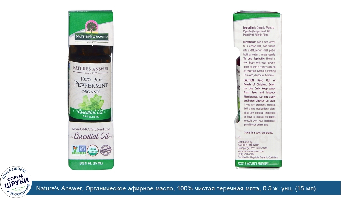 Nature's Answer, Органическое эфирное масло, 100% чистая перечная мята, 0.5 ж. унц. (15 мл)