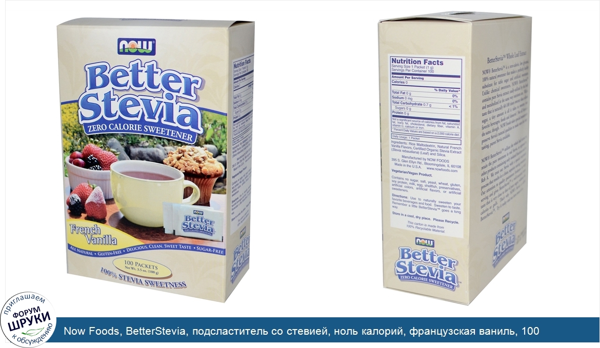 Друзья, если у вас есть отзыв/дополнение/комментарий/вопрос относительно Now Foods, BetterStevia, подсластитель со стевией, ноль калорий, французская ваниль, 100 пакетов, 1 г каждый - напишите его ответом в эту тему (это будет полезно всему сообществу в целом и вам в отдельности).