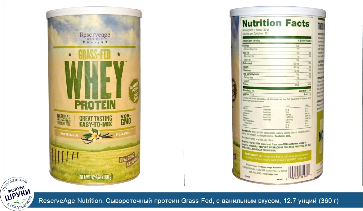 ReserveAge Nutrition, Сывороточный протеин Grass Fed, с ванильным вкусом, 12.7 унций (360 г)