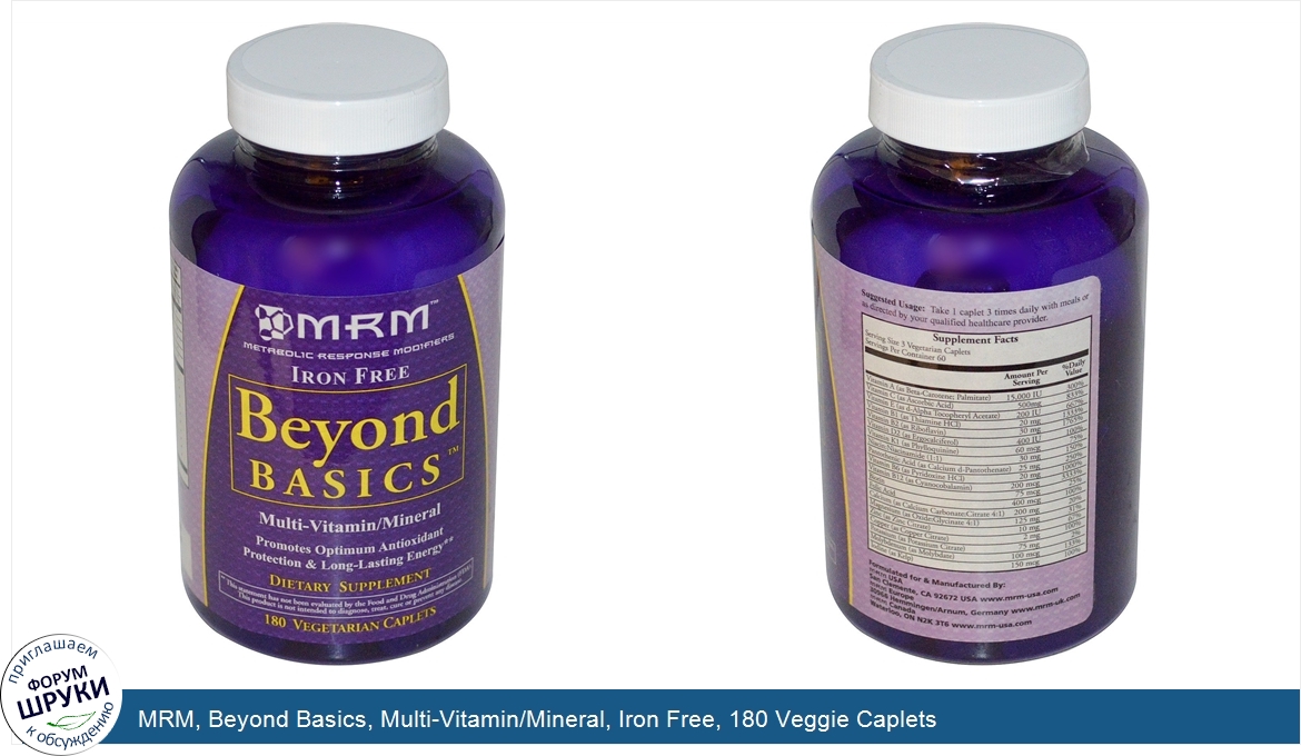 Друзья, если у вас есть отзыв/дополнение/комментарий/вопрос относительно MRM, Beyond Basics, Multi-Vitamin/Mineral, Iron Free, 180 Veggie Caplets - напишите его ответом в эту тему (это будет полезно всему сообществу в целом и вам в отдельности).