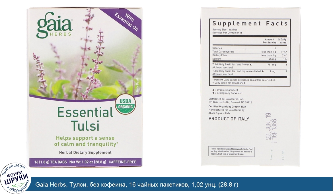 [DESCRIPT]With Essential Oil. Holy Basil. USDA Organic. Helps Support a Sense of Calm and Tranquility. Herbal Dietary Supplement. Certified Organic by Oregon Tilth. Twice as Nice, with Tulsi Leaf and Essential Oil. Nourish your well-being with Essential Tulsi, which blends both the leaf and essential oil of Holy Basil for a fragrant, rich taste that's noticeably different. Earthy and calming, this herbal tea can help you feel centered as it supports a healthy response to the stresses of life. Steeped in a Healthy Lifestyle. Our mission has remained unchanged for nearly 30 years-offer the highest quality herbal supplements to support your health. Our satisfying way of including herbs in daily life is through the ritual of drinking tea. Our respect for this ancient practice is reflected in the quality of our herbs and in tea bags that us no staples or glue. A Partnership of Mutual Beliefs. This tea is produced in Tuscany, Italy, by Aboca, the herbal supplement leader in more than 25,000 European pharmacies and health food stores since 1978. Gaia Herbs' partnership with Aboca is born from a mutual belief in sustainable product development, dedication to quality and a deep respect for science and nature working in harmony.[/DESCRIPT]... (описание дополняется)