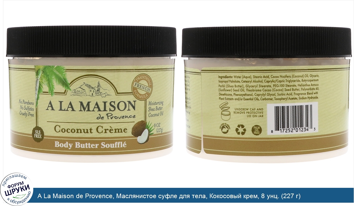 Друзья, если у вас есть отзыв/дополнение/комментарий/вопрос относительно A La Maison de Provence, Маслянистое суфле для тела, Кокосовый крем, 8 унц. (227 г) - напишите его ответом в эту тему (это будет полезно всему сообществу в целом и вам в отдельности).