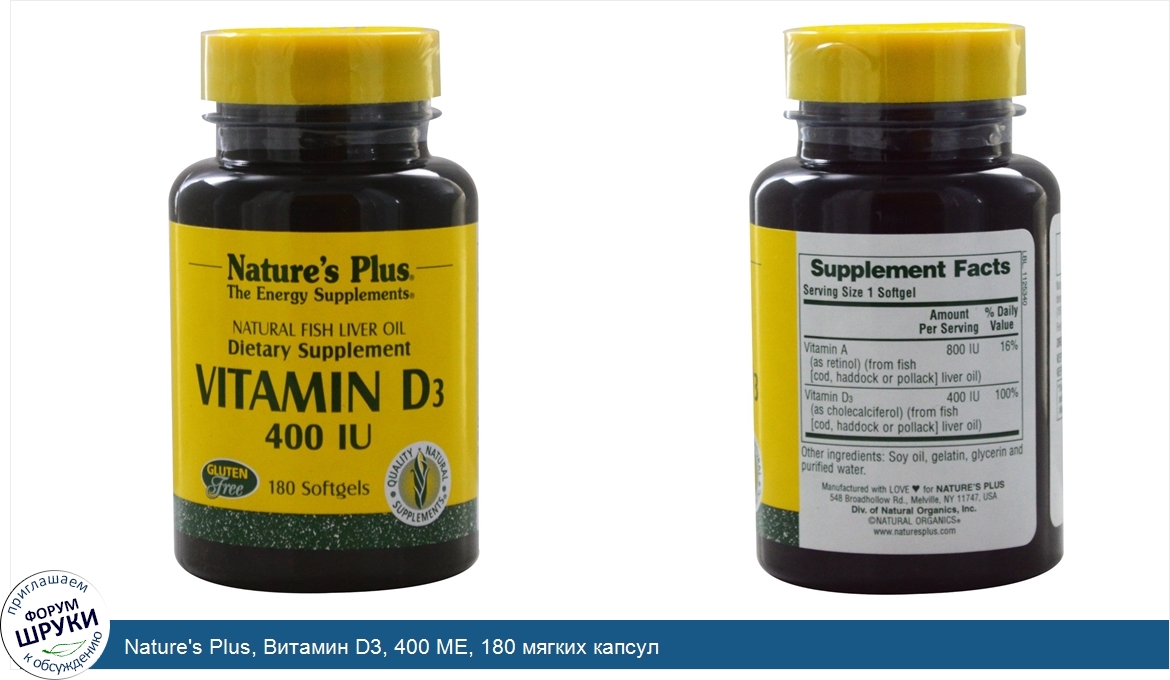 ru Nature's Plus, Витамин D3, 400 МЕ, 180 мягких капсул
