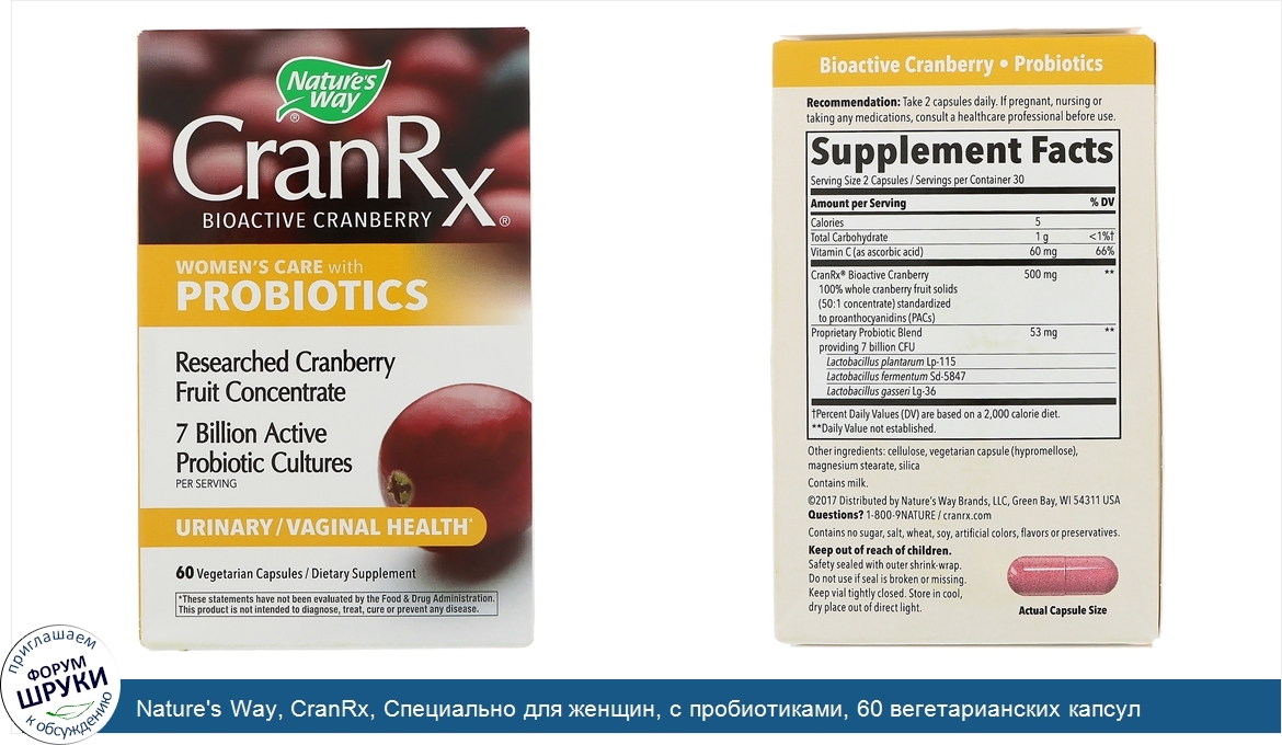 [DESCRIPT]Bioactive Cranberry. Researched Cranberry Fruit Concentrate. 7 Billion Active Probiotic Cultures Per Serving. Urinary / Vaginal Health. Dietary Supplement. Potent 50:1 Concentrate. Each serving derived from 25,000 mg of fresh cranberries. Superior Activity. Standardized to PACs (proanthocyanidins), the key bioactives in cranberries. Premium Cranberries. Including Early Black variety with higher naturally-occurring levels of PACs. 3 Female - Focused Probiotic Strains. L.plantarum Lp-115. L.fermentum Sd-5847. L.gasseri Lg-36. Backed by Research. Researched cranberry fruit concentrate, for urinary health. Just 2 CranRx capsules are equivalent to 10 oz. cranberry juice cocktail (biological activity). Probiotics for Women. 7 Billion CFUs. Supports vaginal health. No need to refrigerate-shelf stable.[/DESCRIPT]... (описание дополняется)