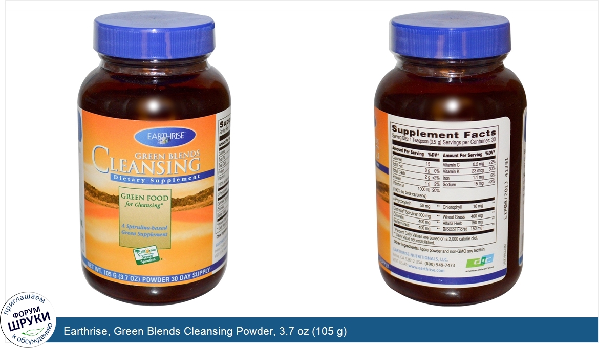 [DESCRIPT]Green Food for Cleansing. A Spirulina-Based Green Supplement. California Grown Spirulina. Dietary Supplement. 30 Day Supply. A Member of the DIC Group. Earthrise Green Blends. - Cleansing Formula helps to detoxify your body naturally. Earthrise Green Blends Cleansing Formula - contains a meaningful combination of Earthrise Spirulina, Chlorella, Barley Grass, Wheat Grass, Alfalfa and other natural greens for detoxification.[/DESCRIPT]... (описание дополняется)