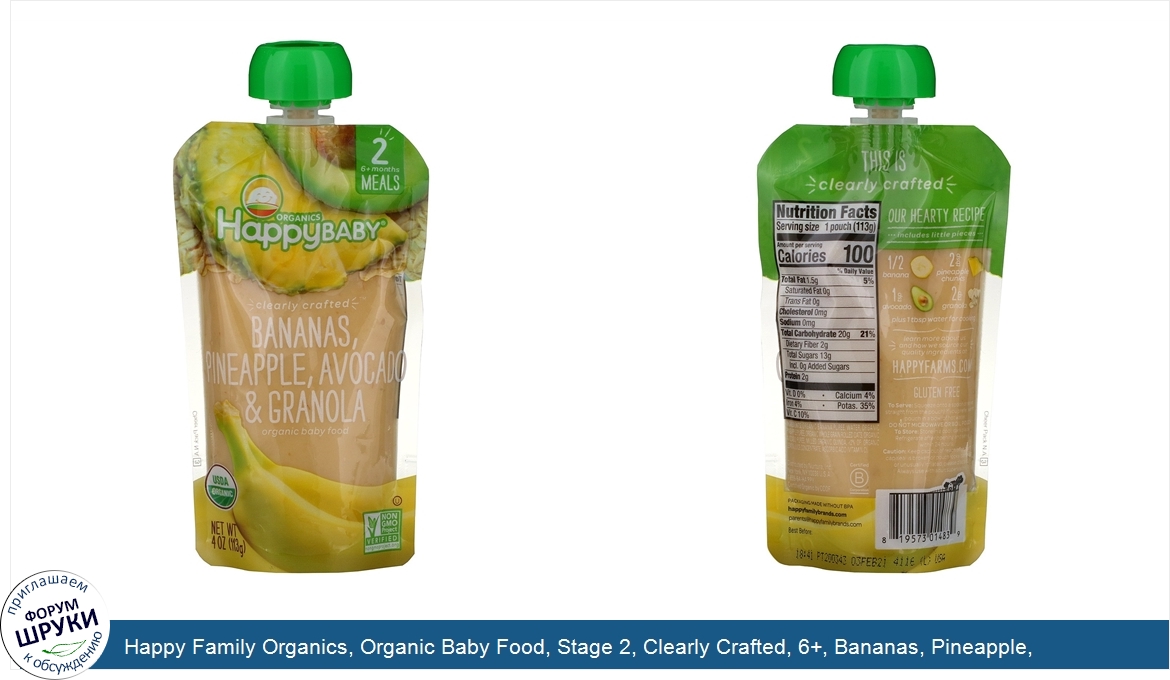Друзья, если у вас есть отзыв/дополнение/комментарий/вопрос относительно Happy Family Organics, Organic Baby Food, Stage 2, Clearly Crafted, 6+, Bananas, Pineapple, Avocado Granola, 4 oz (113 g) - напишите его ответом в эту тему (это будет полезно всему сообществу в целом и вам в отдельности).