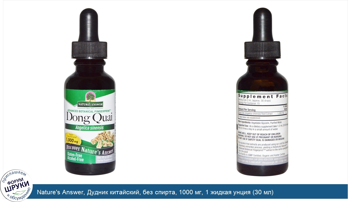 Друзья, если у вас есть отзыв/дополнение/комментарий/вопрос относительно Nature's Answer, Дудник китайский, без спирта, 1000 мг, 1 жидкая унция (30 мл) - напишите его ответом в эту тему (это будет полезно всему сообществу в целом и вам в отдельности).