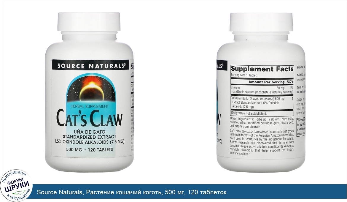 Source Naturals, Растение кошачий коготь, 500 мг, 120 таблеток