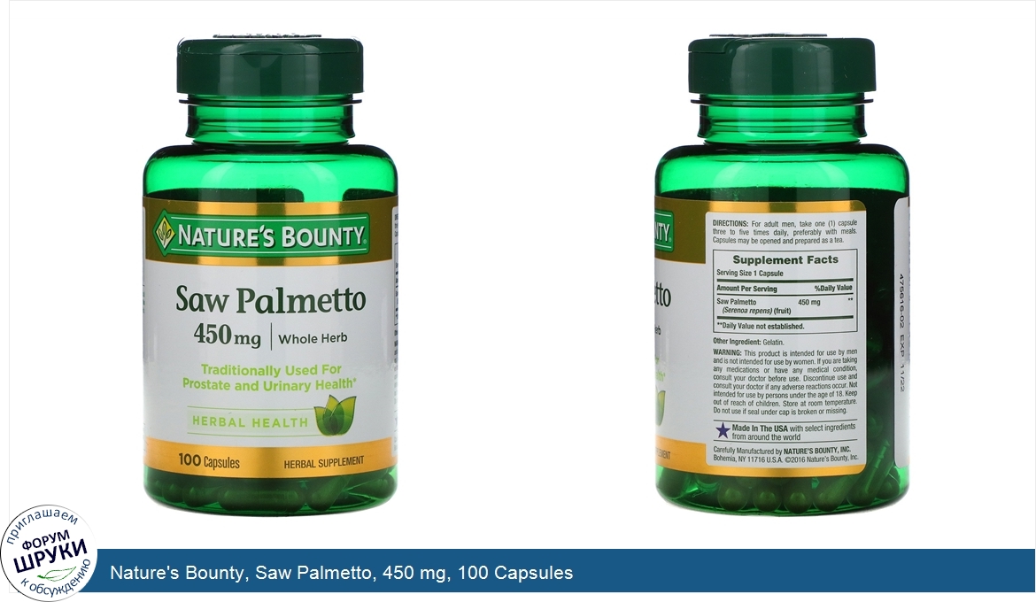 Друзья, если у вас есть отзыв/дополнение/комментарий/вопрос относительно Nature's Bounty, Saw Palmetto, 450 mg, 100 Capsules - напишите его ответом в эту тему (это будет полезно всему сообществу в целом и вам в отдельности).