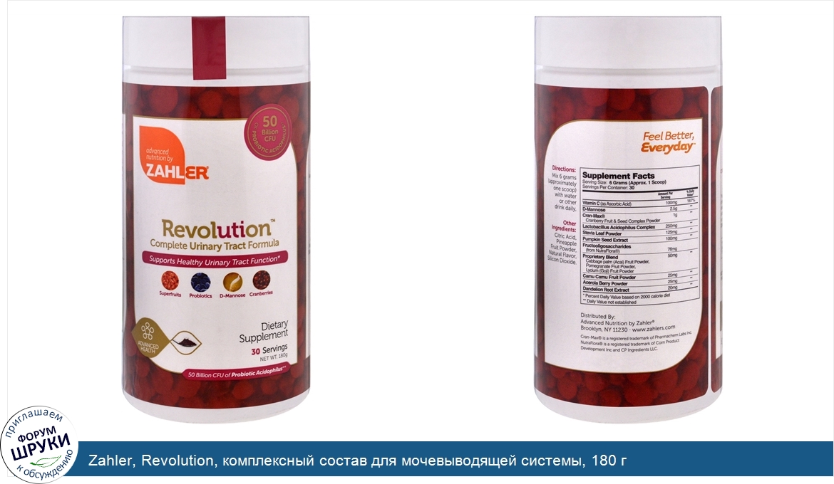 [DESCRIPT]Advanced Nutrition by Zahler. 50 Billion CFU of Probiotic Acidophilus**. Supports Healthy Urinary Tract Function. Superfruits - Probiotics - D-Mannose - Cranberries. Advanced Health. Dietary Supplement. 30 Servings . Feel Better, Everyday. Kosher Pareve. GMP Certified Facility. Dairy Free. Soy Free. Supports Healthy Urinary Tract Function. Revolution contains a powerful blend of natural ingredients such as our proprietary blend of superfruits, D-Mannose, cranberries, prebiotics and probiotics, to support a healthy urinary tract. **at time of manufacturer.[/DESCRIPT]... (описание дополняется)