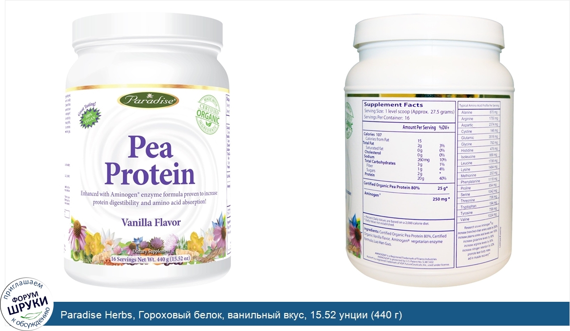 Друзья, если у вас есть отзыв/дополнение/комментарий/вопрос относительно Paradise Herbs, Гороховый белок, ванильный вкус, 15.52 унции (440 г) - напишите его ответом в эту тему (это будет полезно всему сообществу в целом и вам в отдельности).