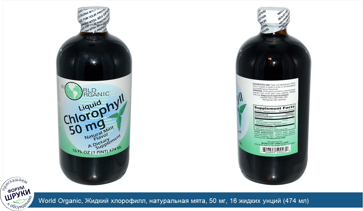 World Organic, Жидкий хлорофилл, натуральная мята, 50 мг, 16 жидких унций (474 мл)