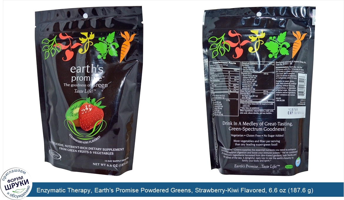 Друзья, если у вас есть отзыв/дополнение/комментарий/вопрос относительно Enzymatic Therapy, Earth's Promise Powdered Greens, Strawberry-Kiwi Flavored, 6.6 oz (187.6 g) - напишите его ответом в эту тему (это будет полезно всему сообществу в целом и вам в отдельности).