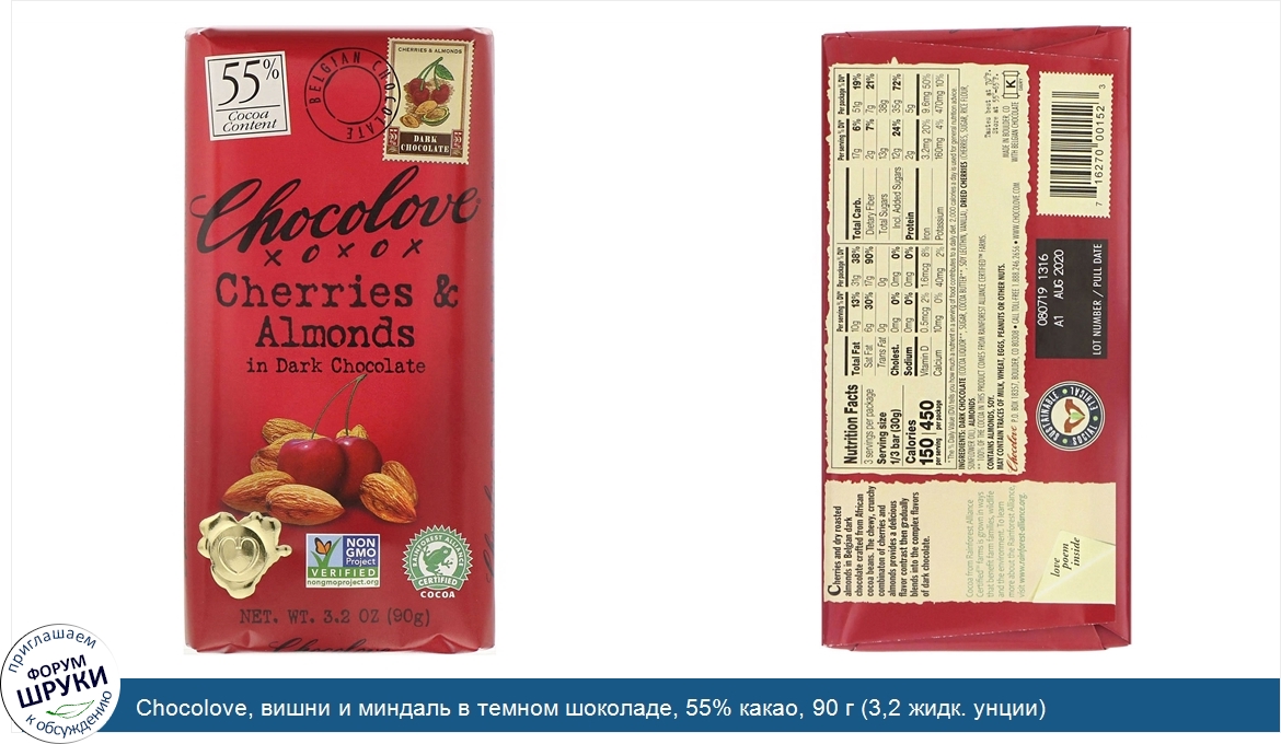 Друзья, если у вас есть отзыв/дополнение/комментарий/вопрос относительно Chocolove, вишни и миндаль в темном шоколаде, 55% какао, 90 г (3,2 жидк. унции) - напишите его ответом в эту тему (это будет полезно всему сообществу в целом и вам в отдельности).
