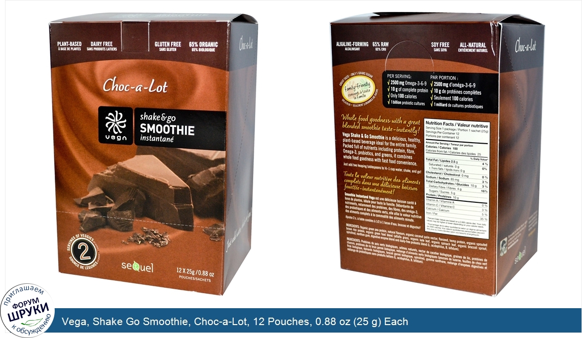 Друзья, если у вас есть отзыв/дополнение/комментарий/вопрос относительно Vega, Shake Go Smoothie, Choc-a-Lot, 12 Pouches, 0.88 oz (25 g) Each - напишите его ответом в эту тему (это будет полезно всему сообществу в целом и вам в отдельности).
