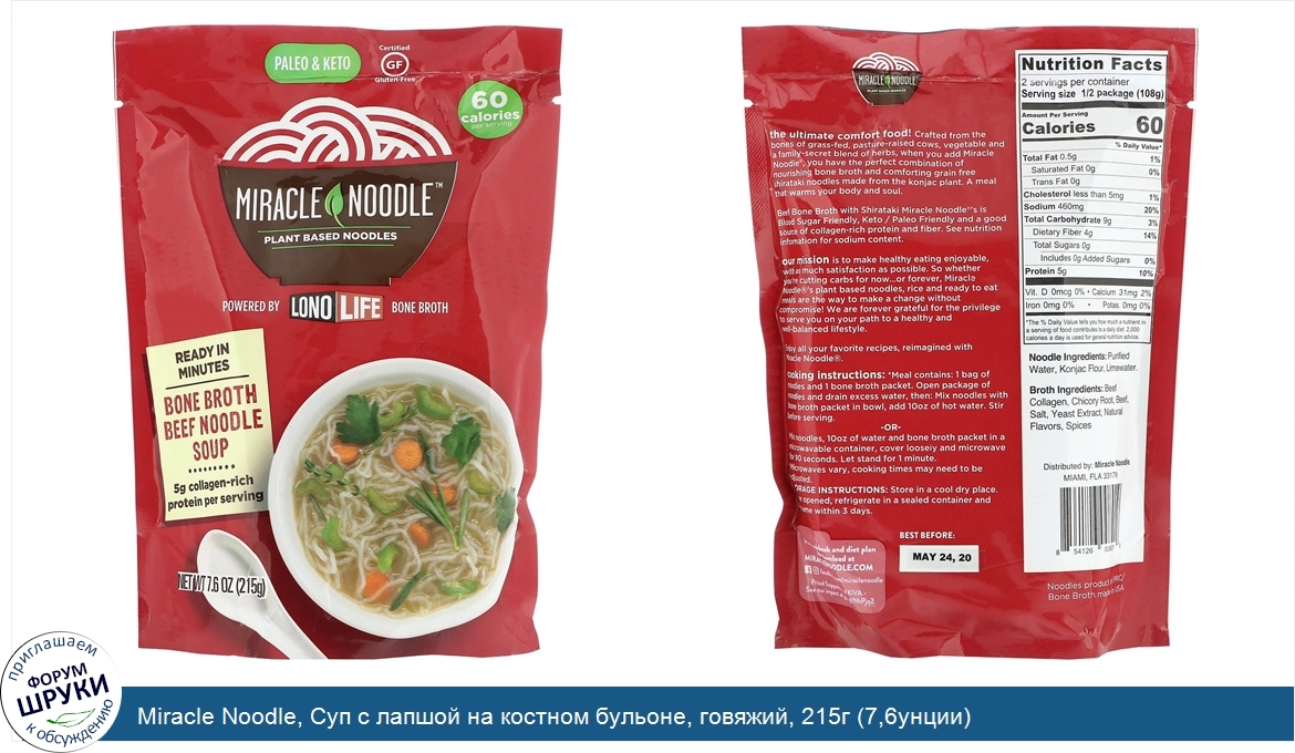 Друзья, если у вас есть отзыв/дополнение/комментарий/вопрос относительно Miracle Noodle, Суп с лапшой на костном бульоне, говяжий, 215г (7,6унции) - напишите его ответом в эту тему (это будет полезно всему сообществу в целом и вам в отдельности).
