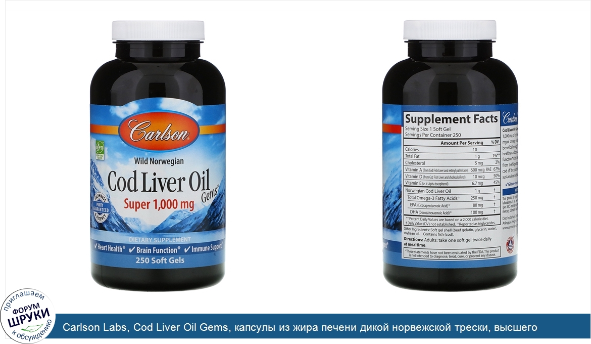 Друзья, если у вас есть отзыв/дополнение/комментарий/вопрос относительно Carlson Labs, Cod Liver Oil Gems, капсулы из жира печени дикой норвежской трески, высшего качества, 1000мг, 250капсул - напишите его ответом в эту тему (это будет полезно всему сообществу в целом и вам в отдельности).