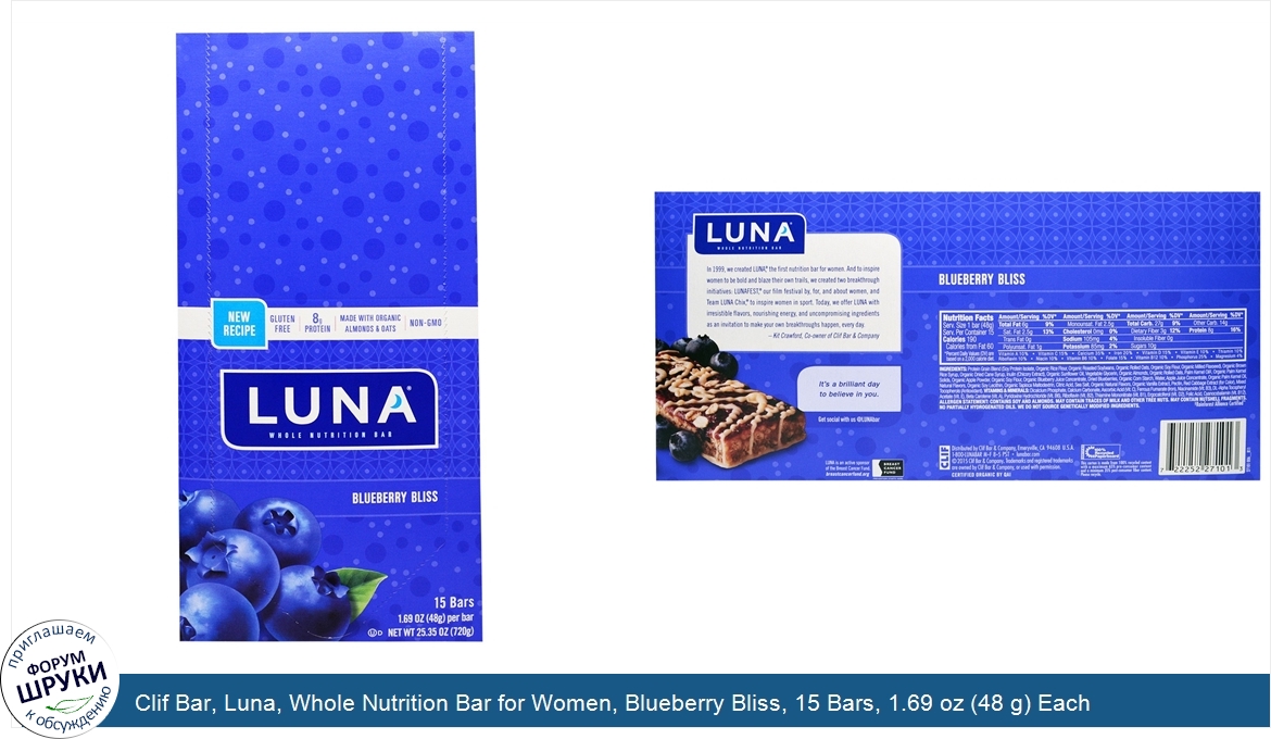 Clif Bar, Luna, Whole Nutrition Bar for Women, Blueberry Bliss, 15 Bars, 1.69 oz (48 g) Each