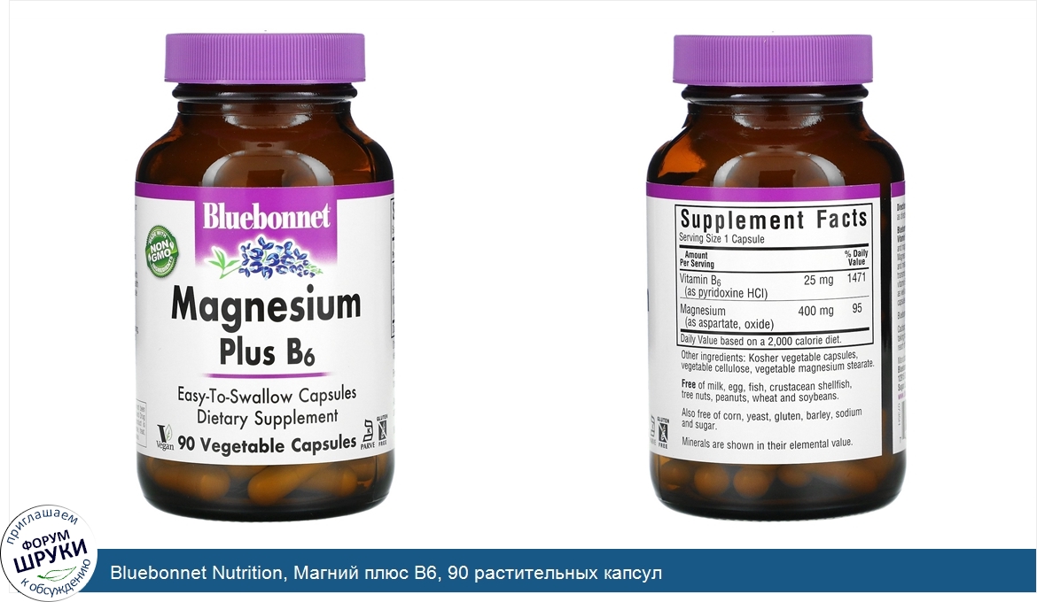 Легкопроглатываемые капсулы. Веганский продукт. Кошерный продукт. Не содержит глютена. Пищевая добавка. Изготовлено из ингредиентов, не содержащих ГМО. Магний 400 мг плюс витамин B6 в капсулах от Bluebonnet содер...