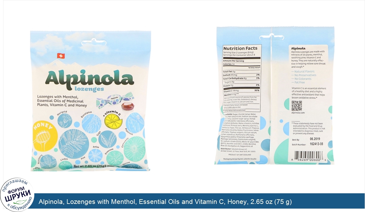 [DESCRIPT]Essential Oils of Medicinal Plants, Vitamin C and Honey. Marigold. Eucalyptus. Peppermint. Blackberry. Linden. Pine. Sage. Anise. Primrose. Chamomile. Thyme. Mallow. Yarrow. Natural Flavors. No Preservatives. No Colorants. Fat Free. Alpinola Lozenges are made with extracts of 20 plants, menthol, soothing pine, vitamin C and honey. They are naturally effective in helping relieve sore throat and cough. Vitamin C is an essential element of a healthy diet and a highly effective antioxidant that helps lessen oxidative stress.[/DESCRIPT]... (описание дополняется)