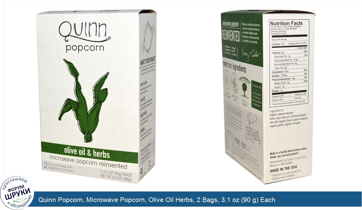 Друзья, если у вас есть отзыв/дополнение/комментарий/вопрос относительно Quinn Popcorn, Microwave Popcorn, Olive Oil Herbs, 2 Bags, 3.1 oz (90 g) Each - напишите его ответом в эту тему (это будет полезно всему сообществу в целом и вам в отдельности).