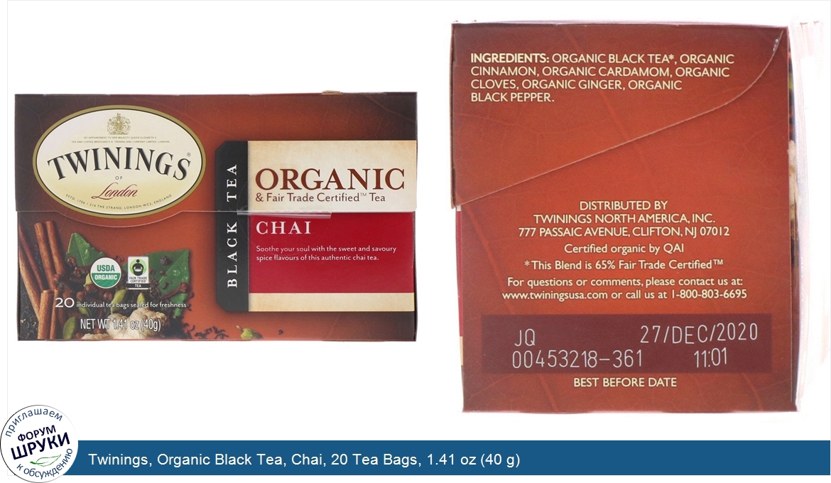 Друзья, если у вас есть отзыв/дополнение/комментарий/вопрос относительно Twinings, Organic Black Tea, Chai, 20 Tea Bags, 1.41 oz (40 g) - напишите его ответом в эту тему (это будет полезно всему сообществу в целом и вам в отдельности).
