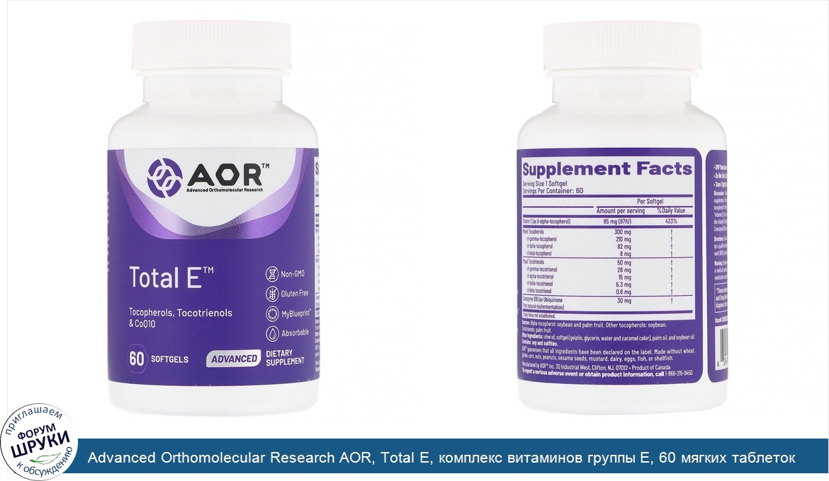 Друзья, если у вас есть отзыв/дополнение/комментарий/вопрос относительно Advanced Orthomolecular Research AOR, Total E, комплекс витаминов группы Е, 60 мягких таблеток - напишите его ответом в эту тему (это будет полезно всему сообществу в целом и вам в отдельности).