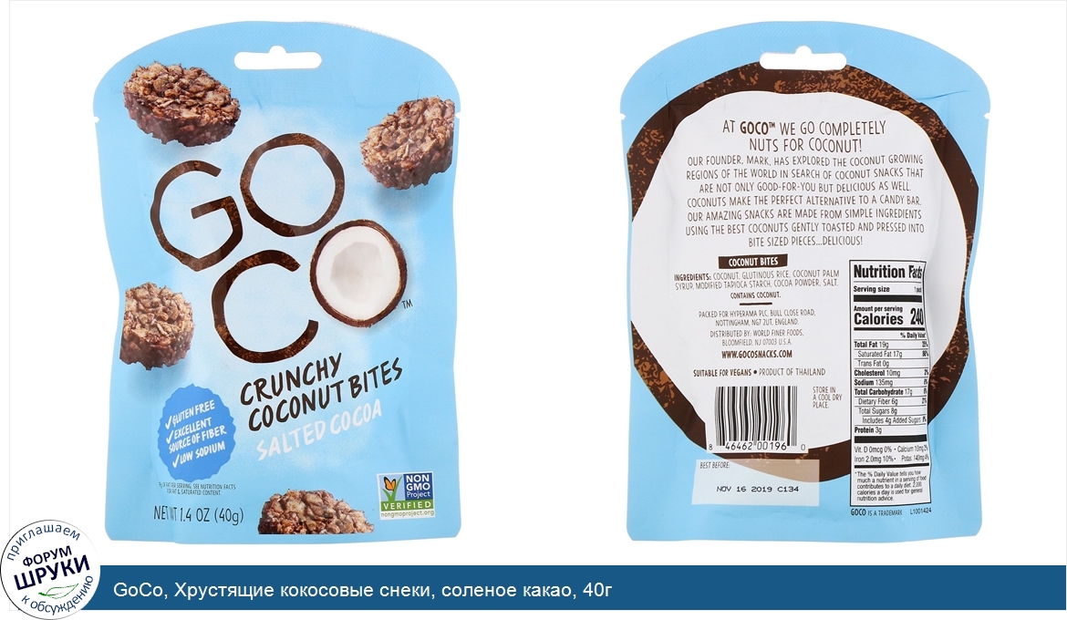 [DESCRIPT]Gluten Free. Excellent Source of Fiber. Low Sodium. Non GMO Project Verified. Suitable For Vegans. 19 g of Fat Per Serving. See nutrition facts for fat saturated content. At Goco we go completely nuts for coconut! Our founder, Mark, has explored the coconut growing regions of the world in search of coconut snacks that are not only good-for-you but delicious as well. Coconuts make the perfect alternative to a candy bar. Our amazing snacks are made from simple ingredients using the best coconuts gently toasted and pressed into bite sized pieces.delicious![/DESCRIPT]... (описание дополняется)