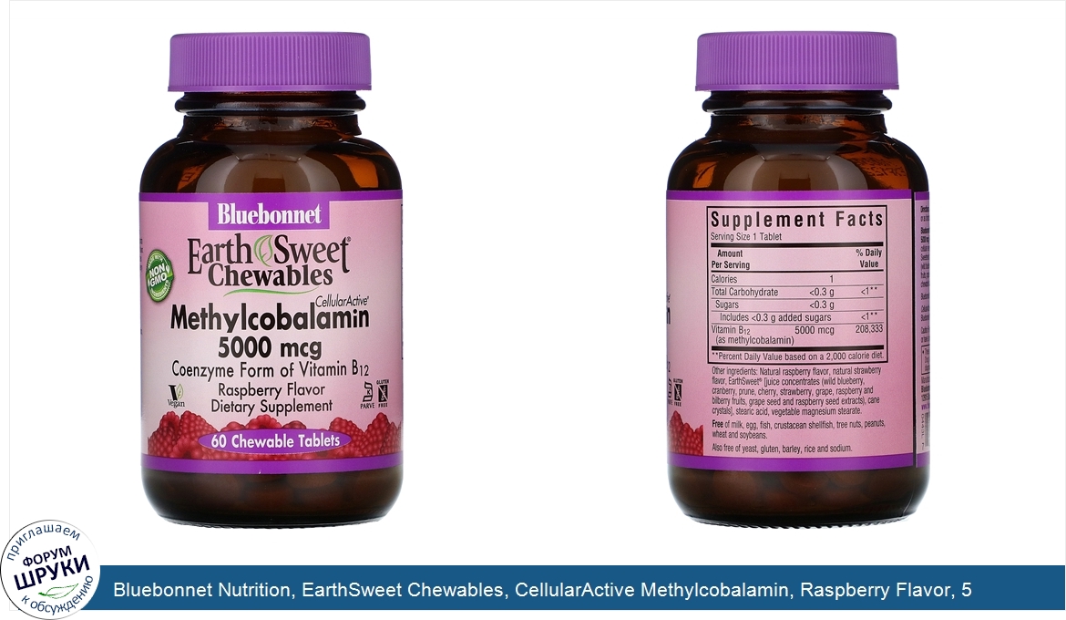 [DESCRIPT]Made with Non GMO Ingredients. CellularActive®. Coenzyme Form of Vitamin B12. Vegan. Kosher Parve. Gluten Free. Dietary Supplement. Bluebonnet's EarthSweet® Chewables CellularActive® Methylcobalamin 5000 mcg Tablets contain the active, coenzyme form of vitamin B-12 that supports cellular energy production and nervous system health in a delicious raspberry flavor. Sweetened with EarthSweet®, a proprietary sweetening mix of juice concentrates (wild blueberry, cranberry, prune, cherry, strawberry, grape, raspberry and bilberry fruits, grape seed and raspberry seed extracts) and cane crystals. Available in chewable tablets for maximum assimilation and absorption.[/DESCRIPT]... (описание дополняется)