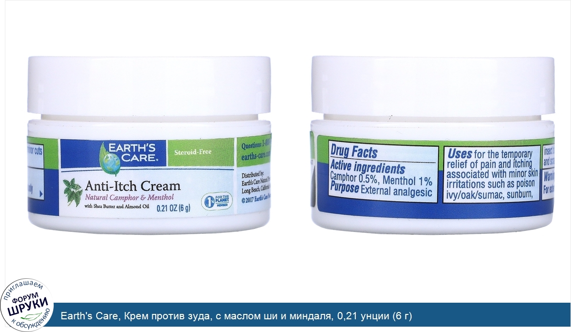 Друзья, если у вас есть отзыв/дополнение/комментарий/вопрос относительно Earth's Care, Крем против зуда, с маслом ши и миндаля, 0,21 унции (6 г) - напишите его ответом в эту тему (это будет полезно всему сообществу в целом и вам в отдельности).