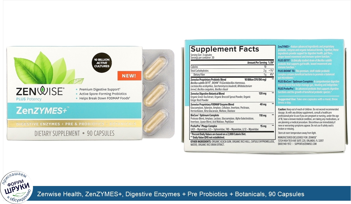 10 Billion Active Cultures. Premium Digestive Support. Active-Spore-Forming Probiotics. Helps Break Down FODMAP Foods. Dietary Supplement. Zenwise. Then Eat. ™. Digestive Delight Starts Here. ZenZYMES+. ™. contai...