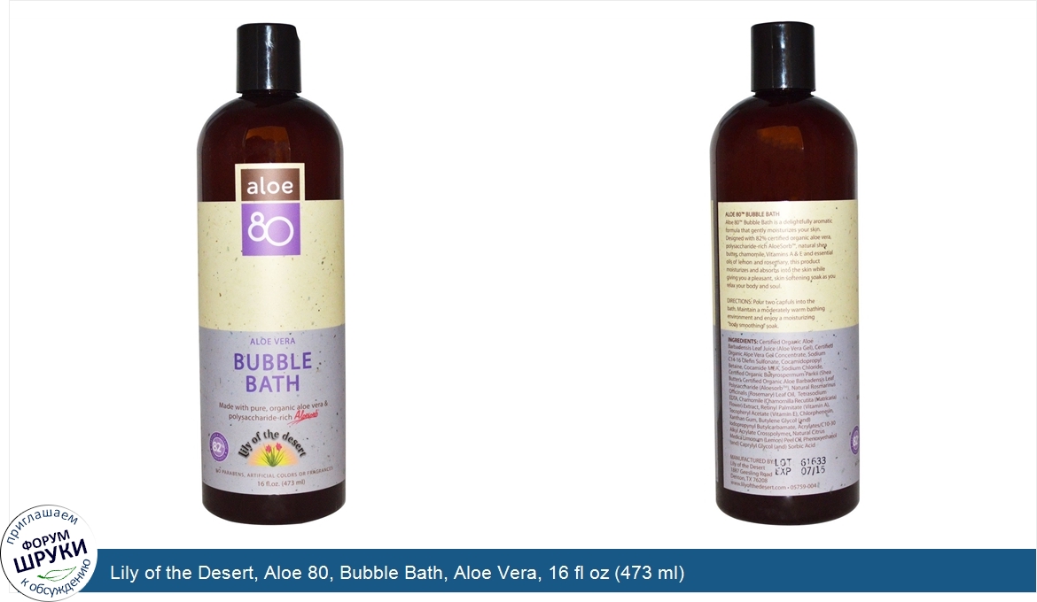 Друзья, если у вас есть отзыв/дополнение/комментарий/вопрос относительно Lily of the Desert, Aloe 80, Bubble Bath, Aloe Vera, 16 fl oz (473 ml) - напишите его ответом в эту тему (это будет полезно всему сообществу в целом и вам в отдельности).