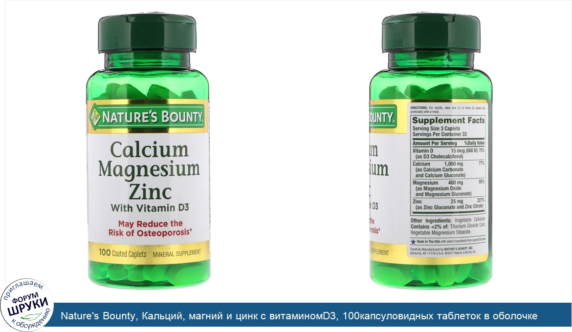 Nature's Bounty, Кальций, магний и цинк с витаминомD3, 100капсуловидных таблеток в оболочке