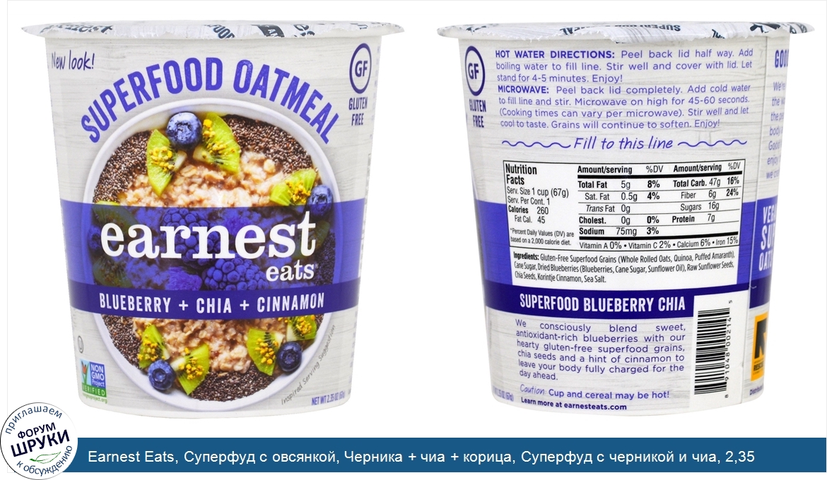 Друзья, если у вас есть отзыв/дополнение/комментарий/вопрос относительно Earnest Eats, Суперфуд с овсянкой, Черника + чиа + корица, Суперфуд с черникой и чиа, 2,35 унции (67 г) - напишите его ответом в эту тему (это будет полезно всему сообществу в целом и вам в отдельности).