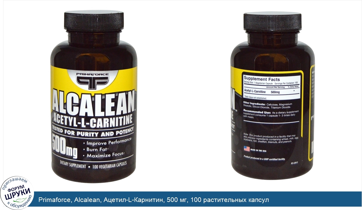 Primaforce, Alcalean, Ацетил-L-Карнитин, 500 мг, 100 растительных капсул