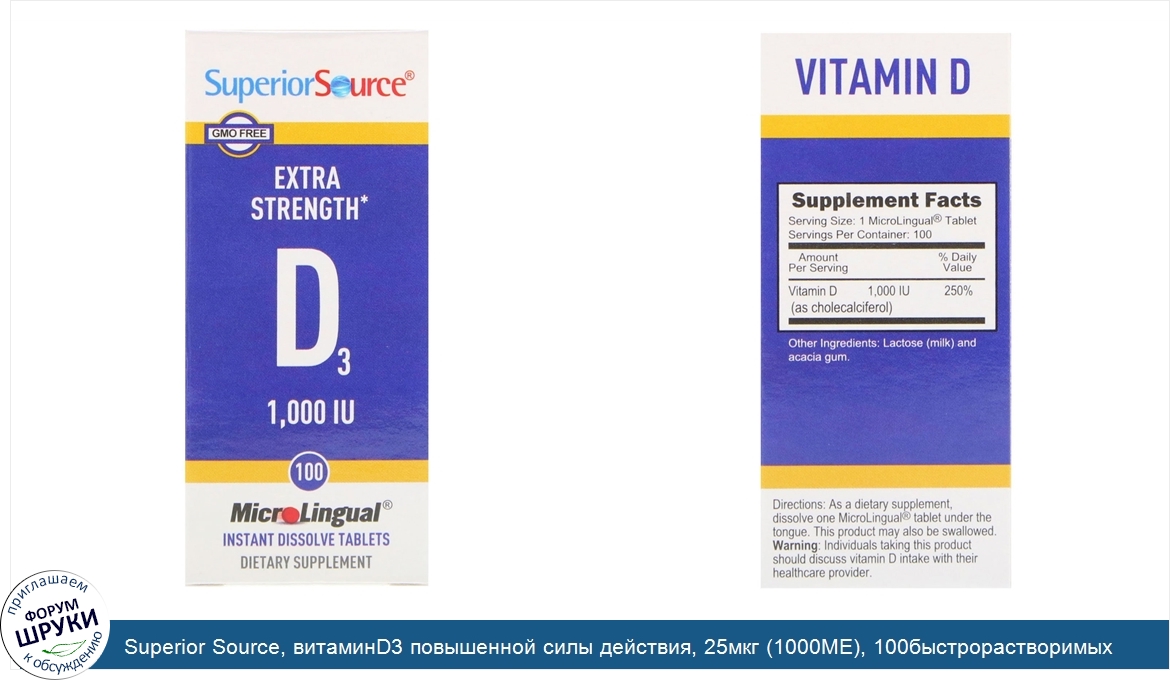 ru Superior Source, витаминD3 повышенной силы действия, 25мкг (1000МЕ), 100быстрорастворимых таблеток MicroLingual