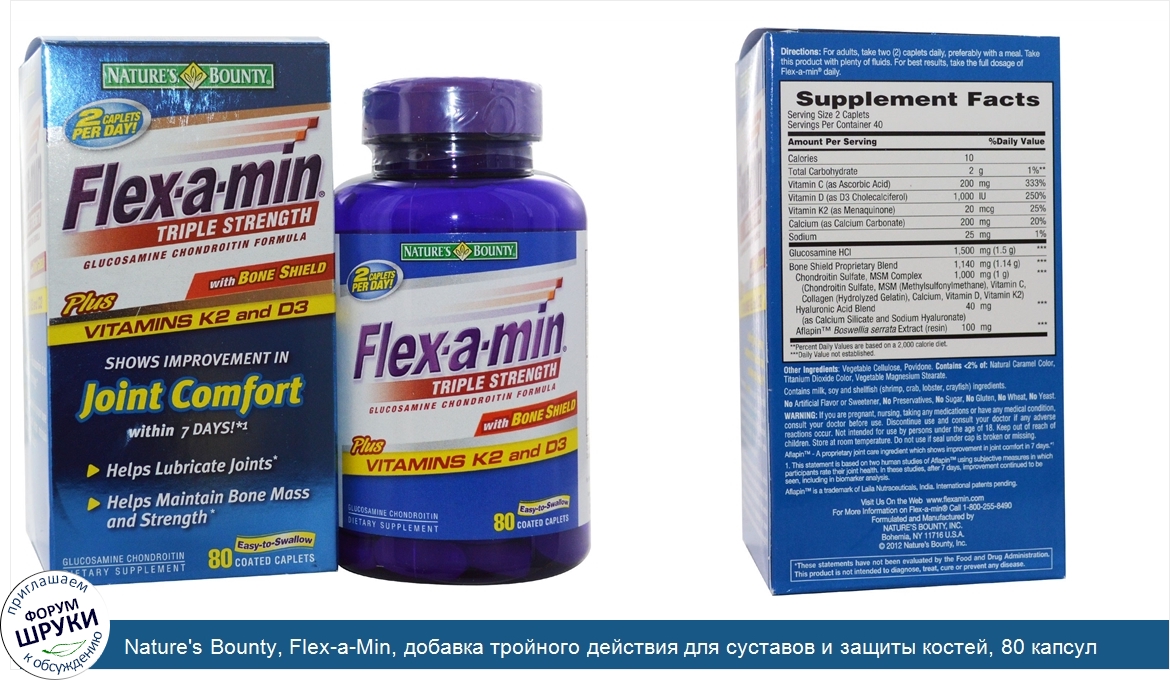 Друзья, если у вас есть отзыв/дополнение/комментарий/вопрос относительно Nature's Bounty, Flex-a-Min, добавка тройного действия для суставов и защиты костей, 80 капсул - напишите его ответом в эту тему (это будет полезно всему сообществу в целом и вам в отдельности).