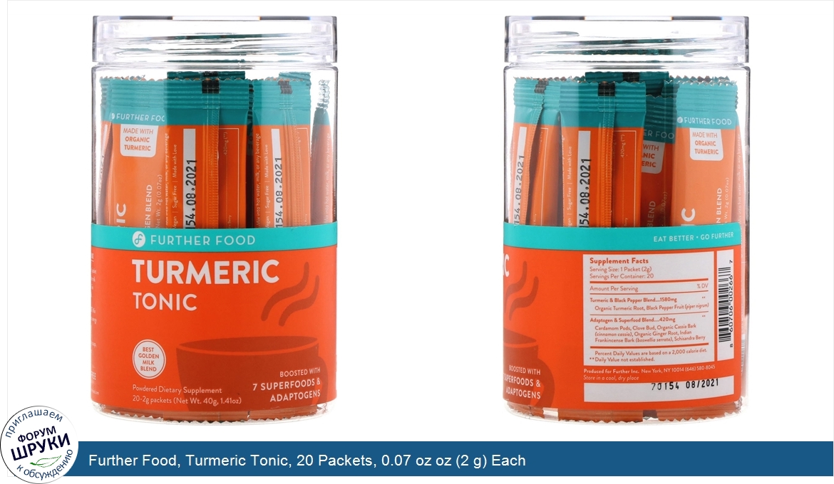 Друзья, если у вас есть отзыв/дополнение/комментарий/вопрос относительно Further Food, Turmeric Tonic, 20 Packets, 0.07 oz oz (2 g) Each - напишите его ответом в эту тему (это будет полезно всему сообществу в целом и вам в отдельности).