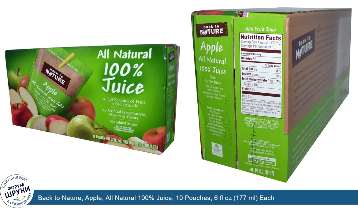 Друзья, если у вас есть отзыв/дополнение/комментарий/вопрос относительно Back to Nature, Apple, All Natural 100% Juice, 10 Pouches, 6 fl oz (177 ml) Each - напишите его ответом в эту тему (это будет полезно всему сообществу в целом и вам в отдельности).
