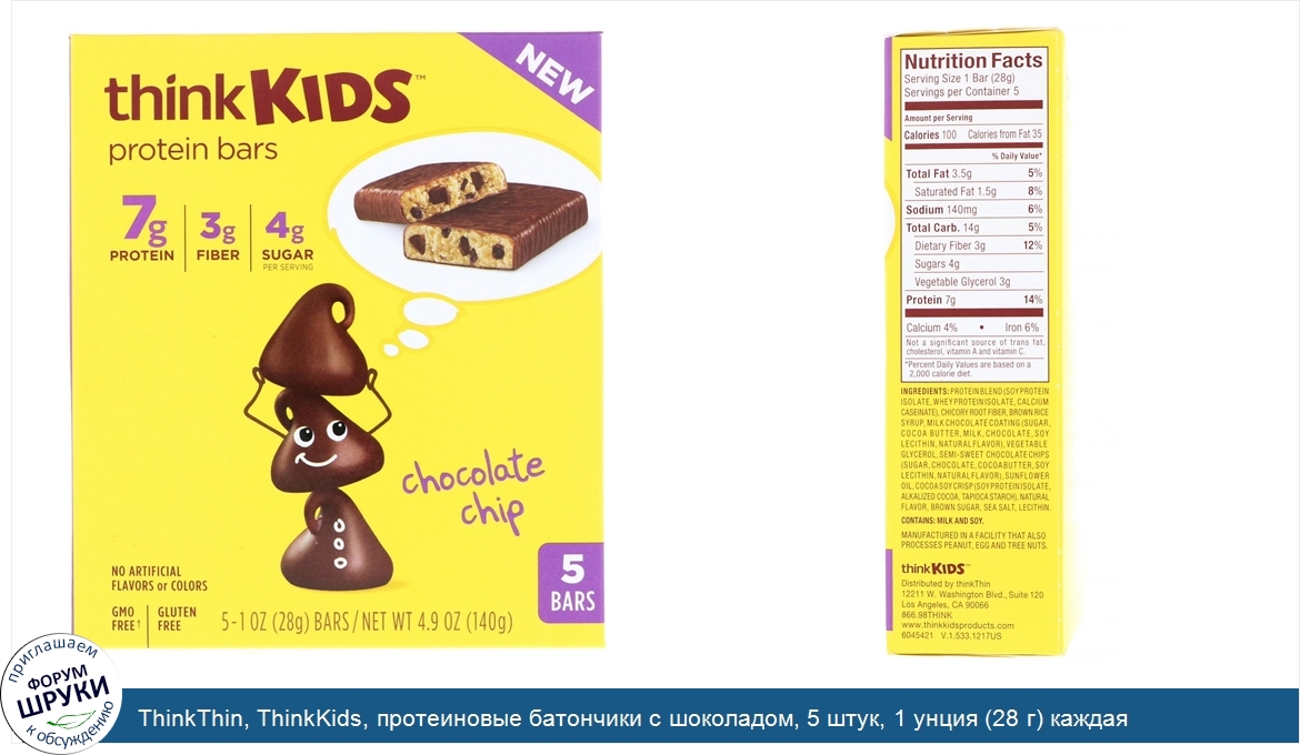 [DESCRIPT]7 g Protein | 3 g Fiber | 4 g Sugar Per Serving. No Artificial Flavors or Colors. GMO Free†. No High Fructose Corn Syrup. Certified Gluten Free. Kosher. In my kitchen, my kids love to get involved and create delicious recipes with me. New thinkKIDS® protein bars are inspired by their favorite flavors. These bars are nutritious, full of protein and fiber, and made with absolutely no artificial flavors or colors. Have a think,. Lizanne - Founder Mom. †All ingredients have been produced without genetic engineering.[/DESCRIPT]... (описание дополняется)
