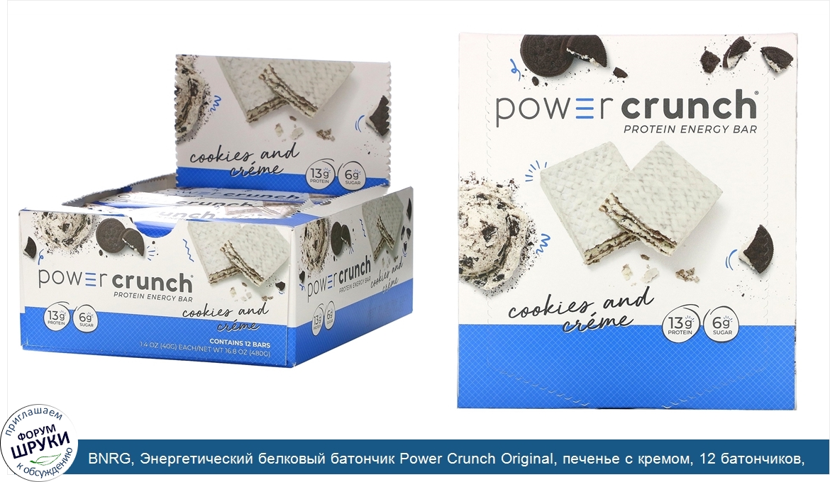 BNRG, Энергетический белковый батончик Power Crunch Original, печенье с кремом, 12 батончиков, вес каждого 40 г (1,4 унции)