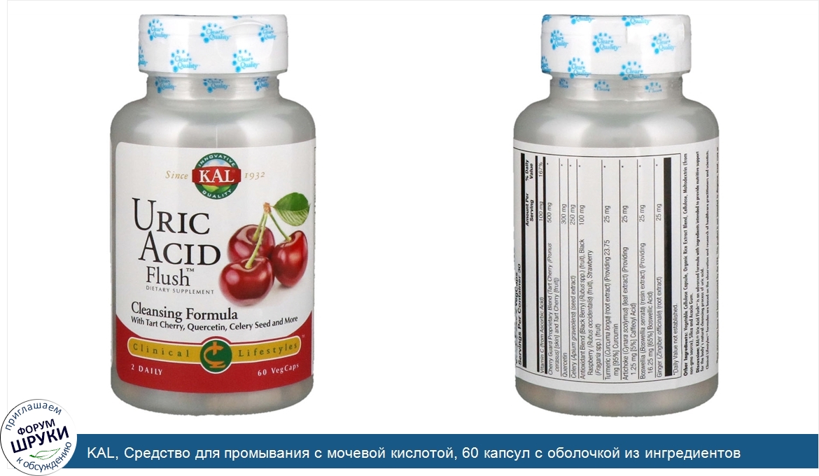Инновационное качество с 1932 года. Пищевая добавка. Очищающая формула. C вишней, кверцетином, щавелем туполистным и др. Clinical Lifestyles. По 2 капсулы в день. KAL Uric Acid Flush – усовершенствованная формула...
