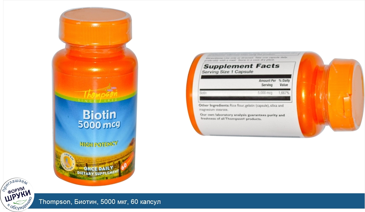 Друзья, если у вас есть отзыв/дополнение/комментарий/вопрос относительно Thompson, Биотин, 5000 мкг, 60 капсул - напишите его ответом в эту тему (это будет полезно всему сообществу в целом и вам в отдельности).