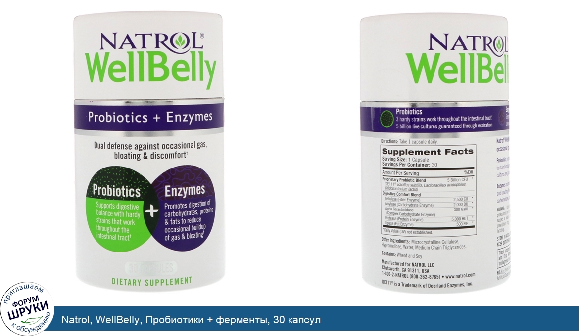 [DESCRIPT]Dual Defense Against Occasional Gas, Bloating Discomfort. Dietary Supplement. Natrol WellBelly provides a dual defense against occasional gas, bloating digestive discomfort. Probiotics. promote the population of beneficial bacteria to maintain digestive balance. Natrol WellBelly's 5 billion live cultures are guaranteed through the life of the product. Enzymes. promote digestion to reduce occasional buildup of gas and bloating. WellBelly's 5 enzyme types break down complex carbohydrates, plant-based foods, starches, fats and proteins.[/DESCRIPT]... (описание дополняется)