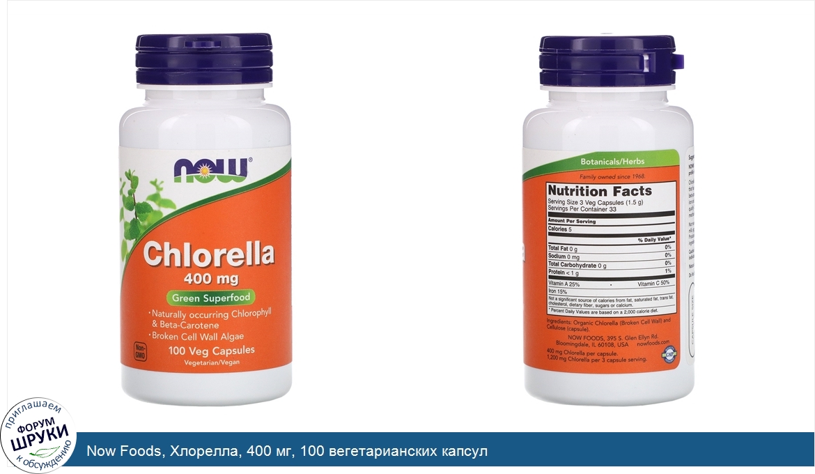 Now Foods, Хлорелла, 400 мг, 100 вегетарианских капсул