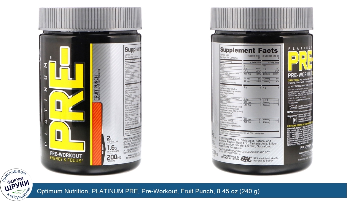 Друзья, если у вас есть отзыв/дополнение/комментарий/вопрос относительно Optimum Nutrition, PLATINUM PRE, Pre-Workout, Fruit Punch, 8.45 oz (240 g) - напишите его ответом в эту тему (это будет полезно всему сообществу в целом и вам в отдельности).
