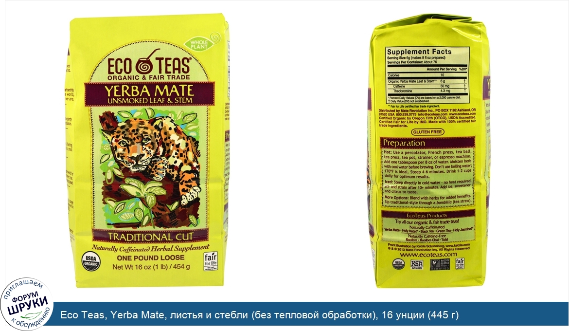 [DESCRIPT]Organic Fair Trade. Whole Plant. Traditional Cut. Naturally Caffeinated Herbal Supplement. USDA Organic. One Pound Loose. Fair For Life- Fair Trade Certified by IMO. Gluten Free. Naturally Caffeinated. Naturally Caffeine- Free. KSA Kosher. Non GMO Project Verified. Certified Organic by Oregon Tilth (OTCO). USDA Accredited. Certified Fair for Life by IMO. Made with 100% Certified Trade Ingredients. Made with 100% Certified Fair Trade Ingredients. Yerba mate is a holly tree native to the rainforest of South America. Its leaves are brewed into a stimulating, antioxidant-rich beverage, mate (say "mah-tay"). Our yerba mate is dried with warm air instead of smoke for a smooth, clean taste. A Sustained Energy Tea Supplement. Enhanced physical energy. Stimulates mental clarity. Supports weight loss regimens that include a balanced diet and exercise . Elevates mood. Aids elimination. Antioxidant Power. When brewed as directed, this tea supplement has an ORAC value of 11,000 umol/240 ml, which is 5.5 times stronger than a typical cup of green tea brewed with a tea bag. Our Eco Commitments. USDA Organic. - Long before we started EcoTeas, we were organic gardeners. For us, organic comes first. Fair for Life -Fair Trade Certified by IMO. - As three best friend working in partnership with small farmers around the world, Fair Trade is just part of who we are. Non GMO Project Verified. - Nature knows best. We can grow plenty of food without upsetting the balance. Our love of nature runs deep. Planting native trees in South America is a small gift back to the world. Proud to Support Clean Energy - b-e-f.org. - We offset our office electricity usage with green tags from the Bonneville Environmental Foundation (BEF). Proud to be Water Steward- b-e-f. org. - For every eight ounces of water used to brew our tea, we work with BEF to restore eight ounces of water to the Rogue River Watershed in southern Oregon.[/DESCRIPT]... (описание дополняется)